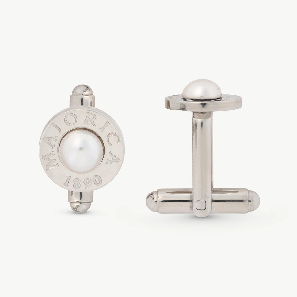 Manžetni gumbi od Majorica čelika, s bijelom polukuglastom bisernom perlom.