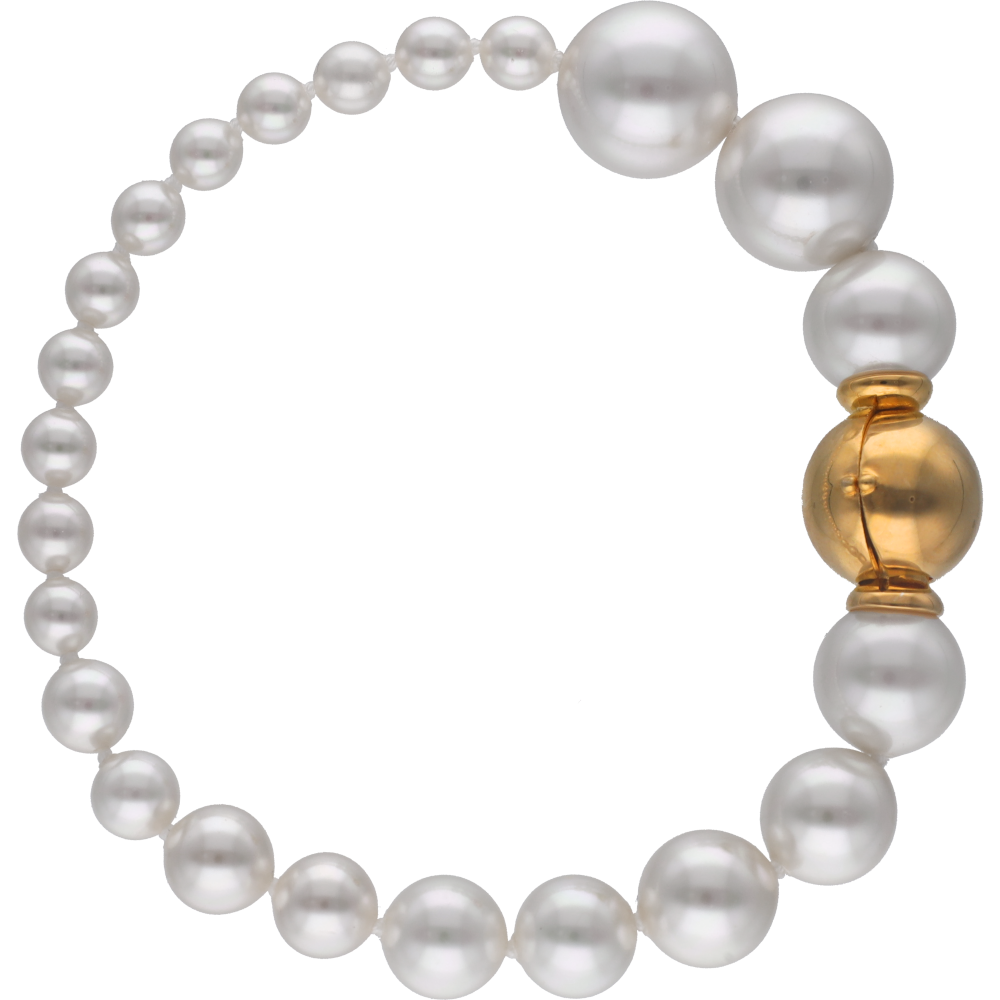 Narukvica od sterling srebra pozlaćena 19 cm. Moderan i svestran dizajn sa posebnom sigurnosnom kopčom. Ručno nanizana i čvorovana s 5 do 12 mm organskim bijelim okruglim biserima.