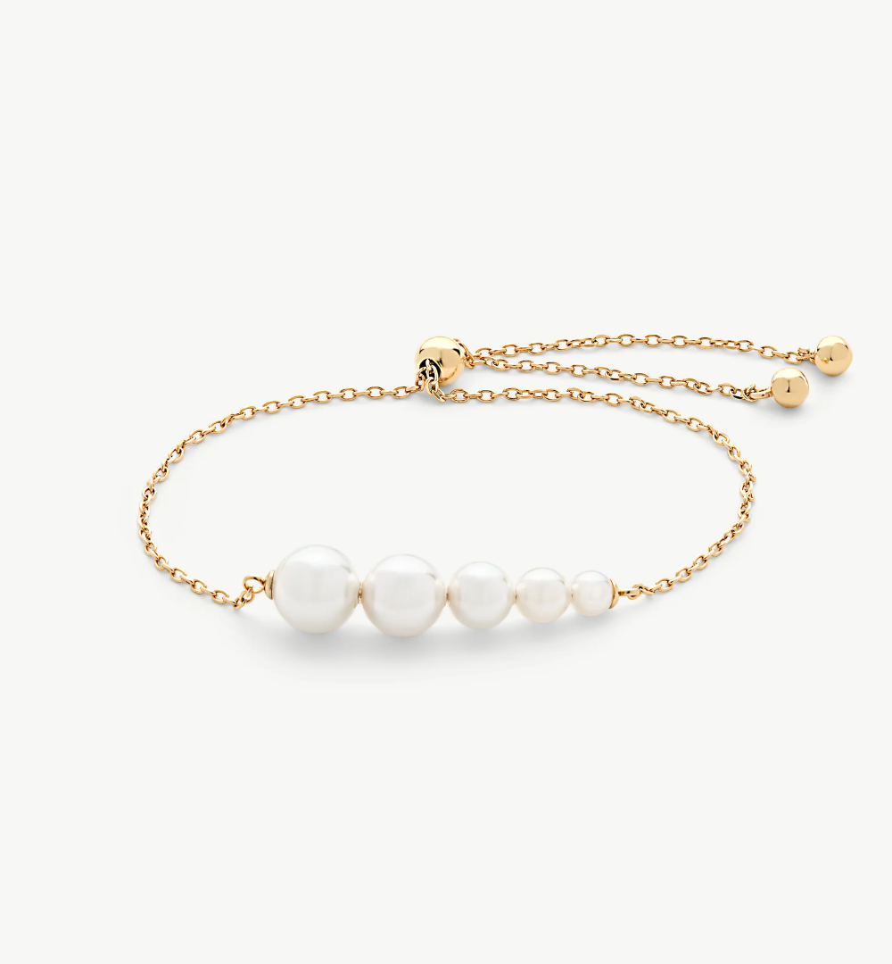 Narukvica od lanca duljine 22 cm, od sterling srebra pozlaćenog zlatom. U središtu se nalazi gradacija bijelih okruglih organskih bisera veličina 4, 5, 6, 7 i 8 mm. Podesiva klizna kopča.