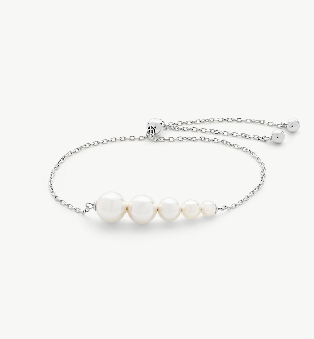 Narukvica od lanca duljine 22 cm, od sterling srebra s rodijskim premazom. U središtu se nalazi gradacija bijelih okruglih organskih bisera veličina 4, 5, 6, 7 i 8 mm. Podesiva klizna kopča.