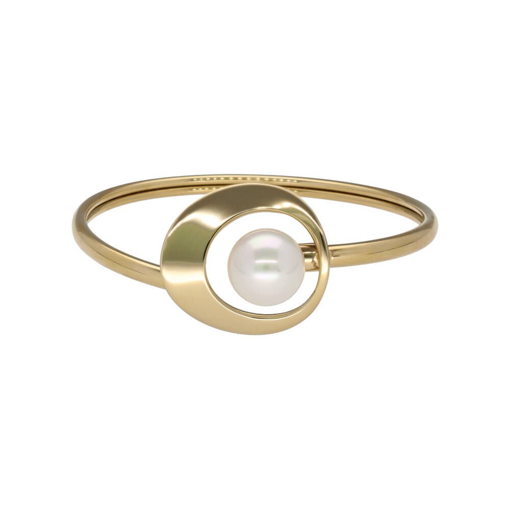 Narukvica dimenzija 46x58 mm od nehrđajućeg čelika s orkuglim bijelim biserom promjera 12 mm.