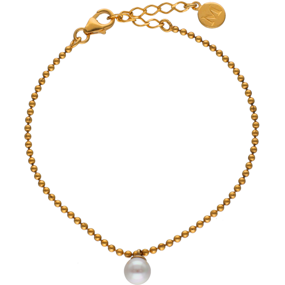 Narukvica duljine 15 cm s kugličnom lancem od čelika pozlaćenog zlatom. Okrugla organska bijela perla promjera 6 mm i produžetak od 3 cm.