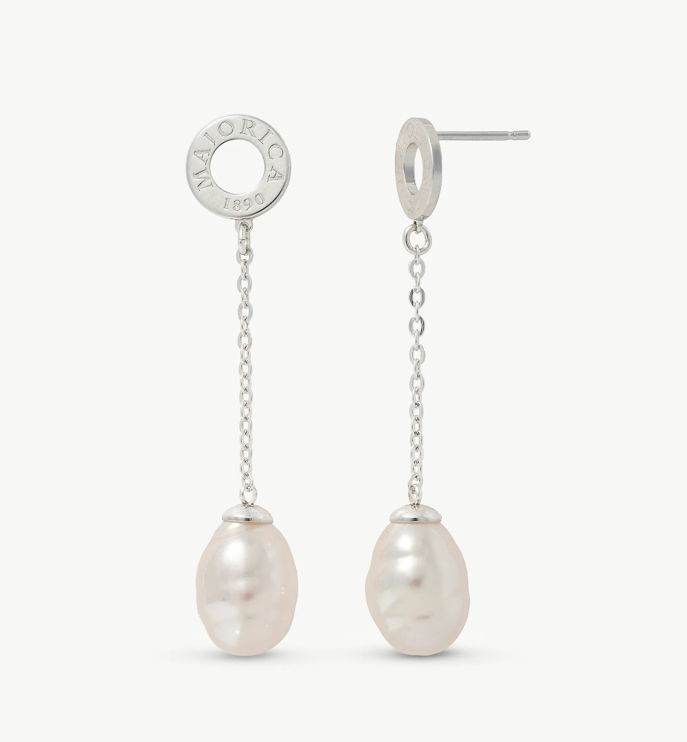 Duge srebrne naušnice s postavljanjem na klin. Barokna biserna biser od 12mm u bijeloj boji.