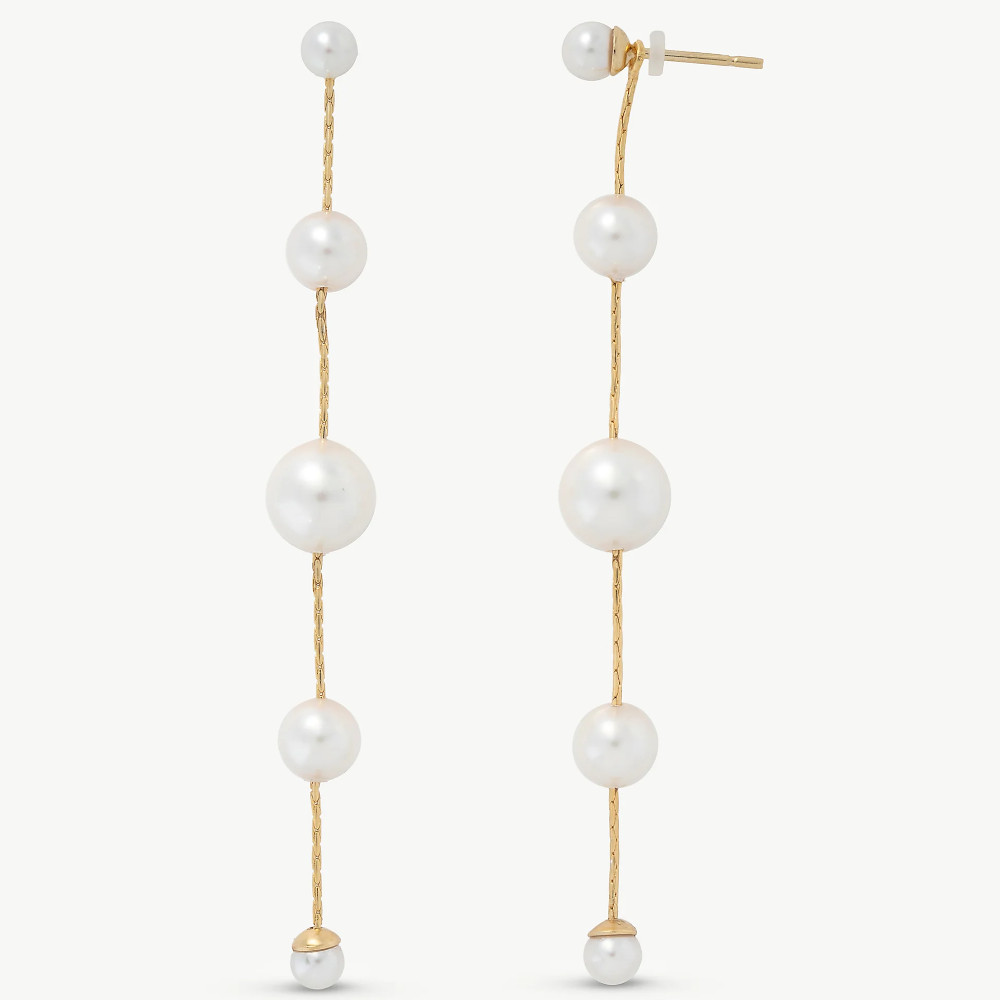 Duge naušnice od srebra s iglicom, s okruglim bijelim perlama promjera 4, 6 i 8 mm. Duljina 7 cm.