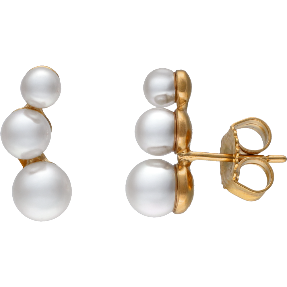 Kratke naušnice s iglicom duljine 1,5 cm, od sterling srebra pozlaćenog zlatom. Minimalističkog i modernog dizajna, s tri bijele okrugle organske biserne perle različitih veličina: 4, 5 i 6 mm.
