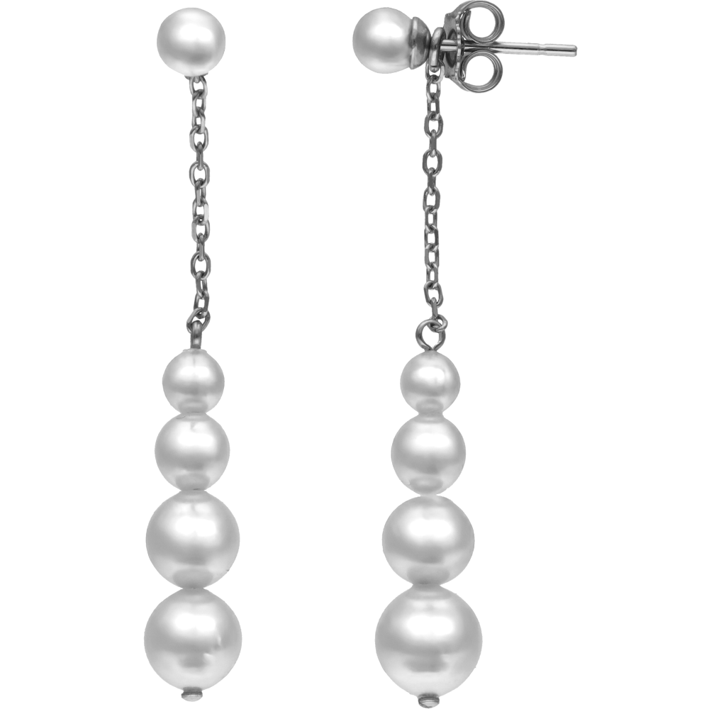 Duge naušnice s iglicom duljine 4,5 cm, od sterling srebra s rodijskim premazom. Delikatnog i mladenačkog dizajna, s pet bijelih okruglih organskih bisera različitih veličina: 4, 5, 6 i 7 mm.