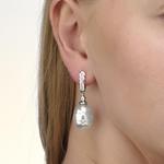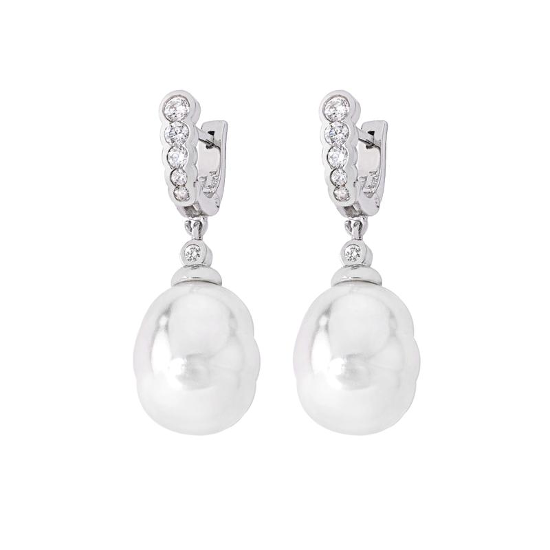 Viseće naušnice od rodiniranog srebra s kopčom samostrijel i baroknim bijelim biserima promjera 14 mm i cirkonima.