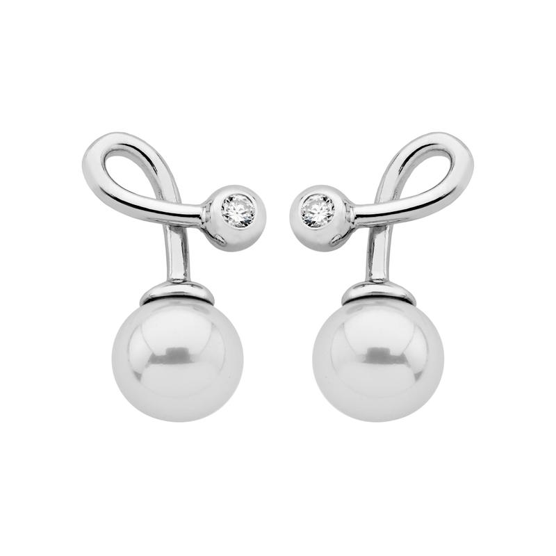 Naušnice srebrne s presvlakom od rodija, kopča s iglom, s okruglim bijelim biserima promjera 10 mm i cirkonima.