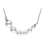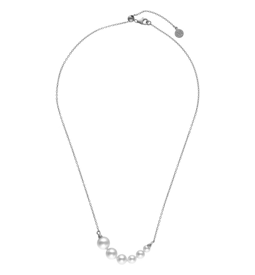 Podesiva ogrlica duljine do 45 cm, s lancem od sterling srebra s rodijskim premazom. U središtu se nalazi gradacija bijelih okruglih organskih bisera veličina 4, 5, 6, 7, 8 i 9 mm. Biseri su ručno nanizani i čvorovani.