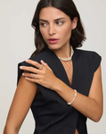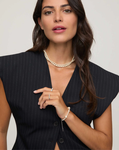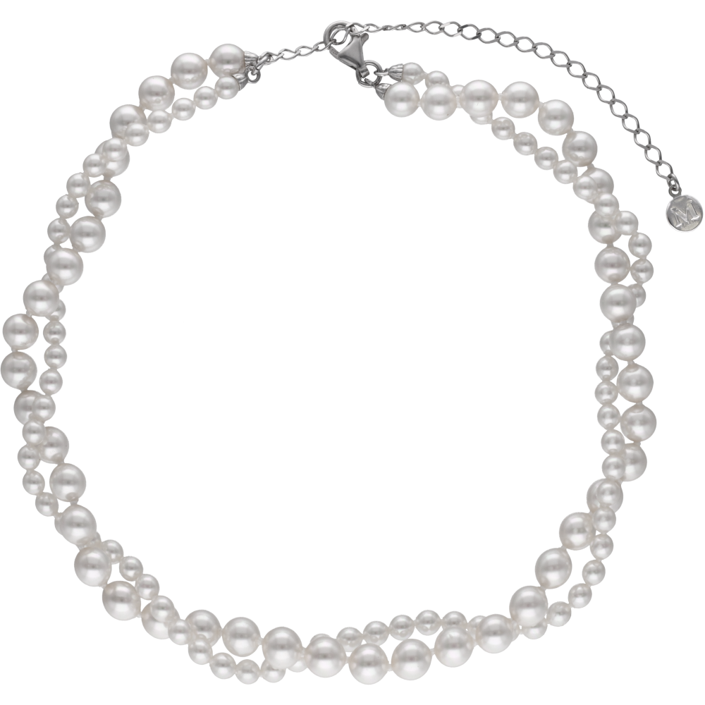 Ogrlica od 32 cm s dva sloja bisera. Elegantan i svestran dizajn koji se prilagođava različitim stilovima i prilikama. Rukom nanizana i čvorovana s bijelim okruglim organskim biserima promjera 4 i 6 mm. Opremljena karabinom i produžetkom od 8 cm, oba u rodijem presvučenom srebru.
