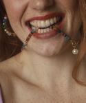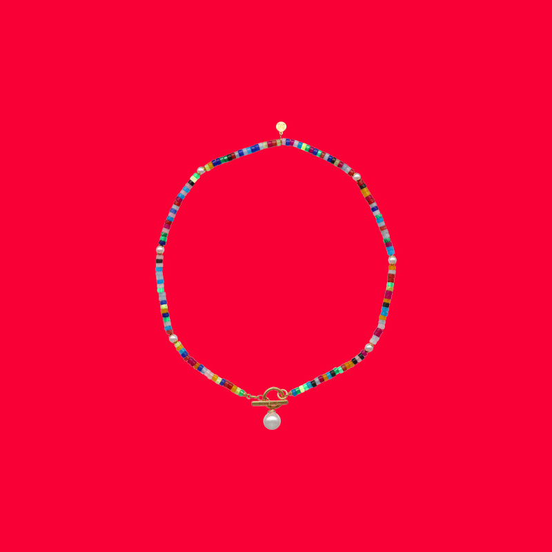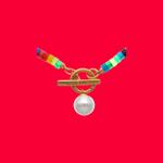 Ogrlica od pozlaćenog srebra dužine 45 cm sa šarenim kremenima, okruglim bijelim biserima promjera 5 mm i privjeskom s okruglim biserom promjera 10 mm.