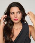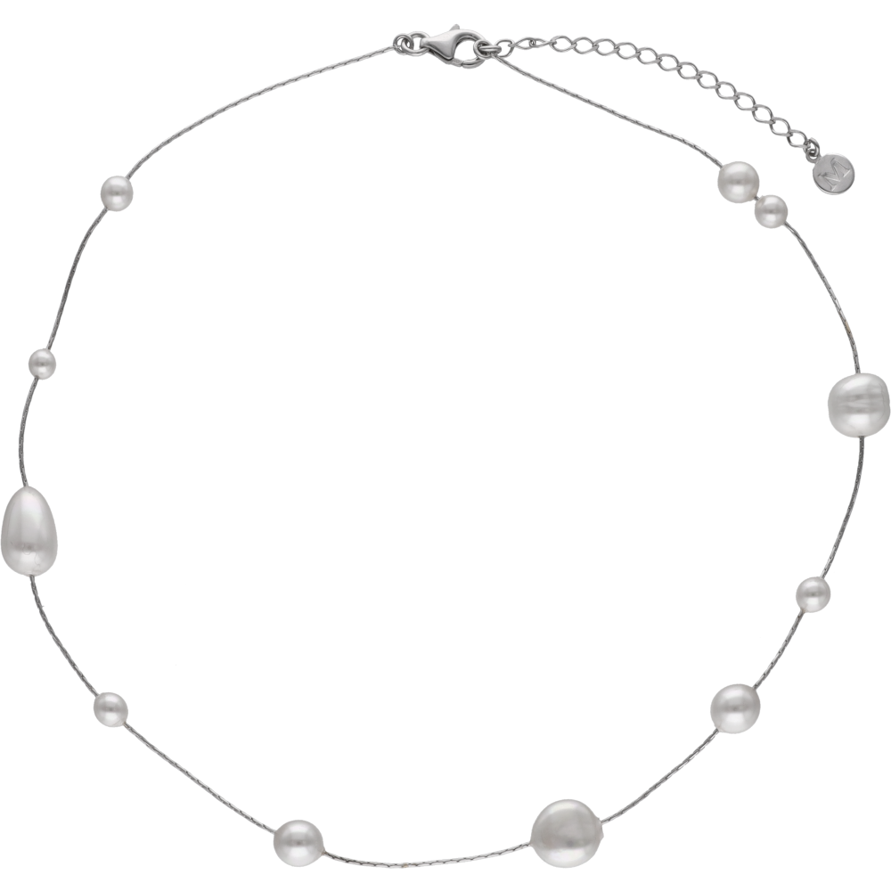 Ogrlica od 37 cm dužine od sterling srebra s rhodijskim premazom. Pravi nakit za upotpunjavanje bilo kojeg outfita, izrađena je od bijelih organskih bisera različitih veličina i oblika: 4, 5, 6, 7, 8, 9 i 10 mm okrugli, barokni, slatkovodni i ovalno-plosnati biseri. Kopča u obliku rakovice i produžetak od 5 cm.