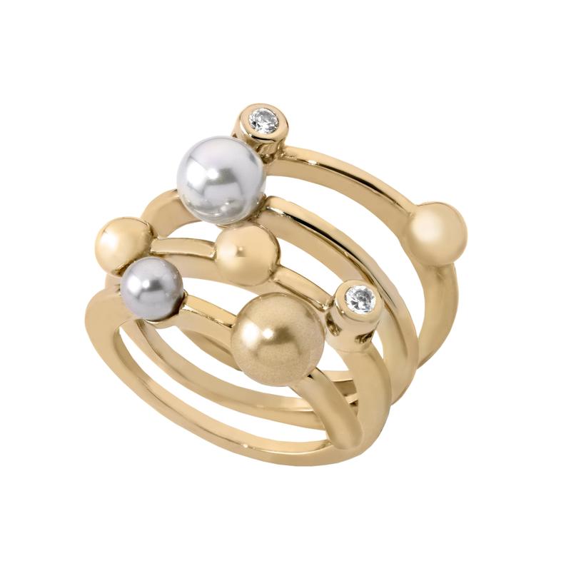 Prsten srebrni s presvlakom od žutog zlata, s okruglim šampanjac, bijelim i svjetlosivim biserima promjera 4/6 mm i cirkonima. Veličina: 53